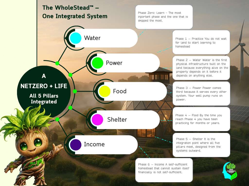 The WholeStead™ Framework is the architecture. It is an eight-phase build sequence that organizes all five pillars of a self-sufficient homestead — Food, Water, Power, Shelter, and Income — into one integrated system where each phase prepares the ground for the next, each pillar strengthens the others, and nothing is built in isolation from everything it depends on.